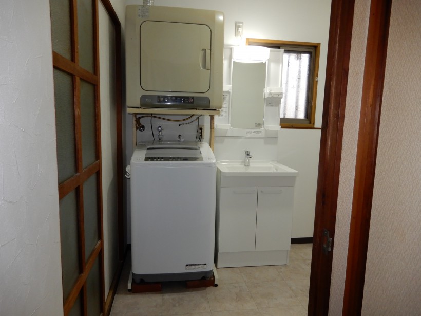 洗面所の勝手口を潰して今まで使用されていたガス衣類乾燥機と洗濯機を取付しました。
