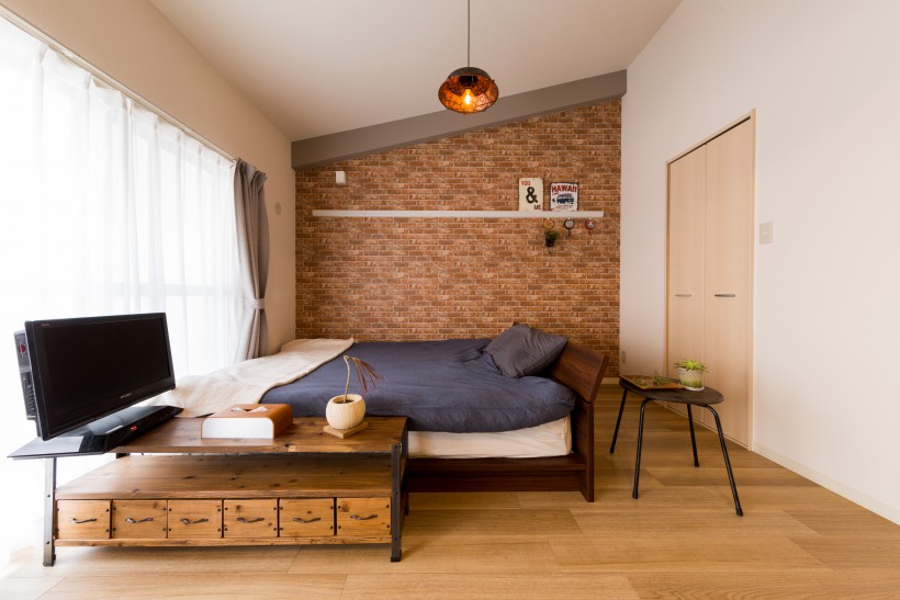 リビングと繋がった空間である寝室もリビングと同様のイメージかつ、落ち着きあるクロス、照明、インテリアでまとまっています。 家具はできるだけ同じ高さのもので揃えたことで、広がりある空間になるよう心掛けました。
