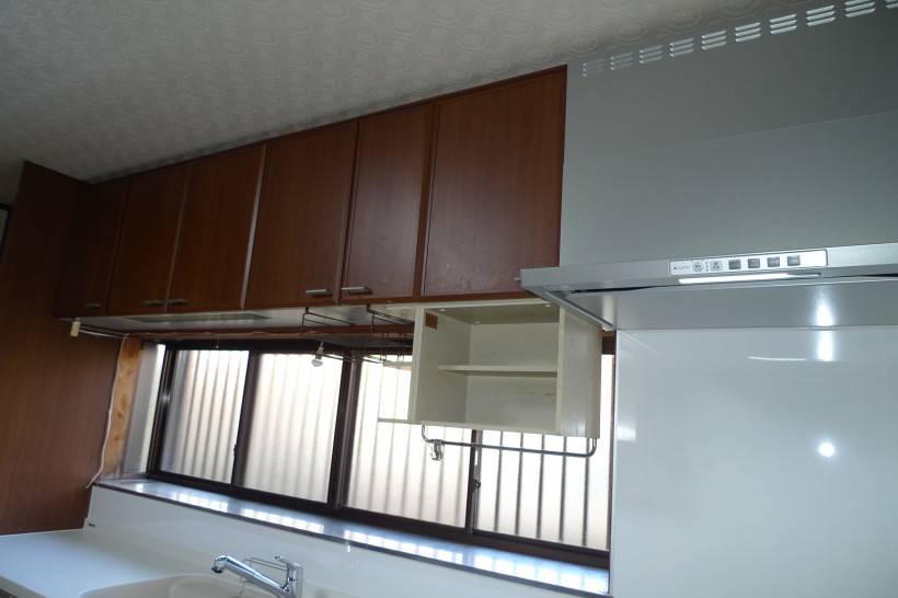 キッチンの長さが3,450その横に900の食器戸棚がありました。お客様から「キッチン替える時は吊戸棚も食器戸棚も取替しないとダメですか?」問合せ頂きました。