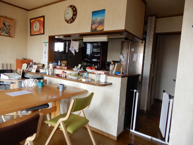 キッチンの上部吊り戸と壁を撤去しました。もみじちゃんの様子をいつも見守れます。