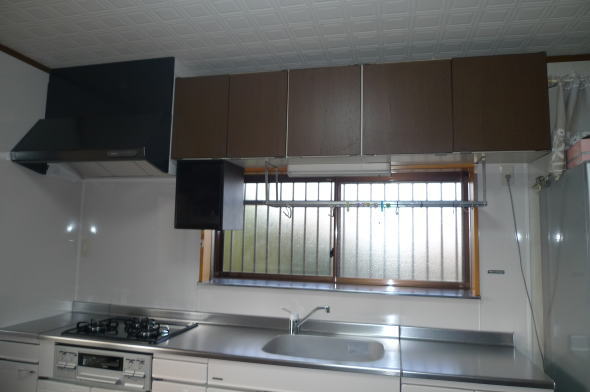 90cmのプロペラ換気扇とフードboxは90cmのレンジフードに変わり吊戸棚は再使用です。