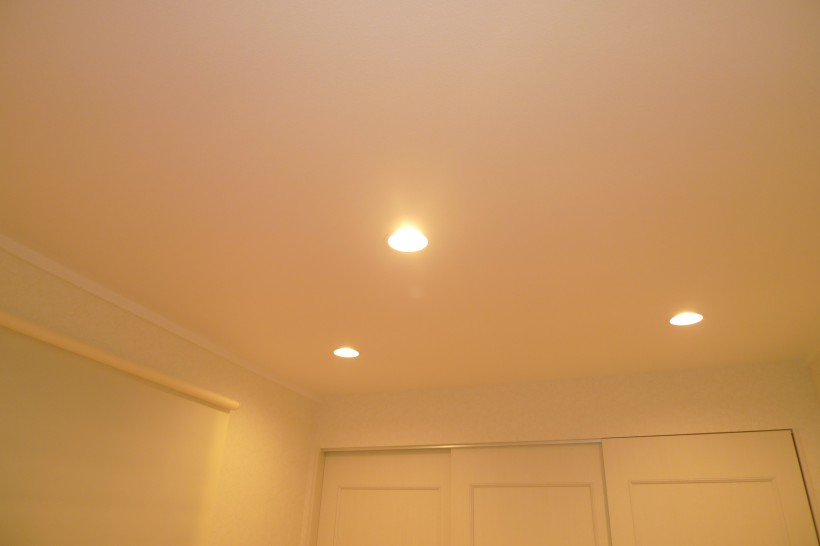 天井の照明はお客様が眩しくないように調光付きダウンライトにしました。
